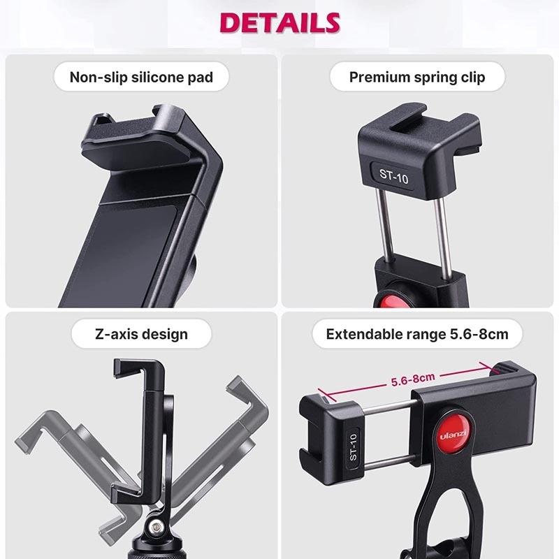• The ST-10 Phone holder is made of Aluminum Alloy, durable and sturdy. It would hold the phone, even the mic and light together without shaking.