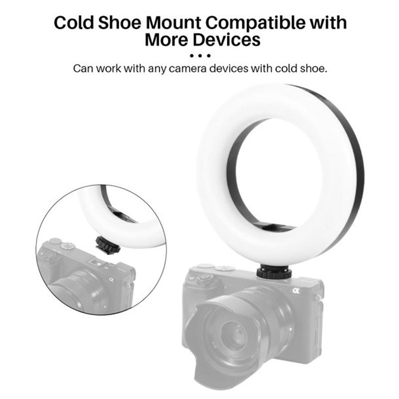 • อะแดปเตอร์รองเท้าเย็นด้านล่างพร้อมรูสกรู 1/4 นิ้วช่วยให้คุณสามารถติดตั้งไฟวงแหวนเข้ากับกล้องด้วยที่ยึดด้วยสกรู 1/4 นิ้ว